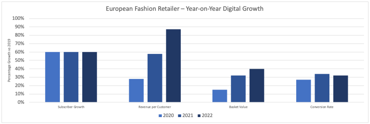 The impact was significant. Subscriber growth reached 60% year-on-year for three consecutive years. Revenue per customer in email rose 28% annually through segmentation modelling. Average basket value grew by 40% with the introduction of personalisation, and conversion rates on landing pages improved by 34%.